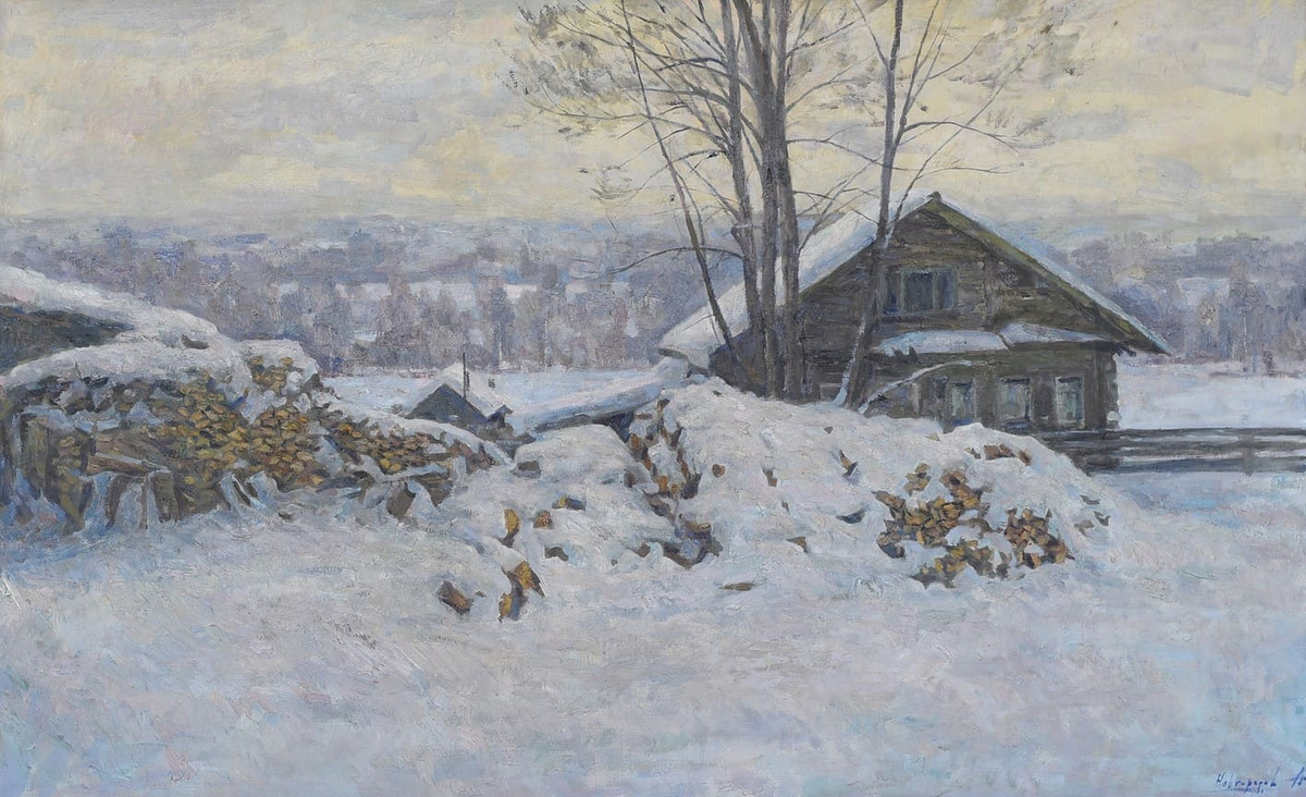 Для рассказа о пейзажистах картины располагают по временам года. С Новгородовым так не пойдет. У него всегда люты (февраль), как сказали бы мои предки - белорусы. Отчего ж февраль? Я применяю термин не по названию месяца, а по тому, как художник относится к своему предназначению. Я бы сказал, по-лютому. Лютый – значит, "свирепый", "яростный", "очень сильный". Пейзаж Новгородова означает маршруты жизни. Вот как на этой картине. Твой маршрут проходит через эту глубокую колею. Не проедешь? – но может пройдешь, проберешься? Ведь впереди свет, и поле, и дома за полем. А как иначе, ну что пройдешь? Сам художник, Анатолий Владимирович Новгородов – светлый человек, добрый и веселый, – ему бы сказки рисовать, как Васнецов, а он все ныряет в глубину, на которую спускались может быть Левитан и Саврасов. Контуры чуть размыты. Его природа глубже дышит, чем в реальности, а где-то грустит, где-то стонет, воет, плачет. Ну а пробьет час для радости, так дома выстраиваются в рядок, будто для хорово
