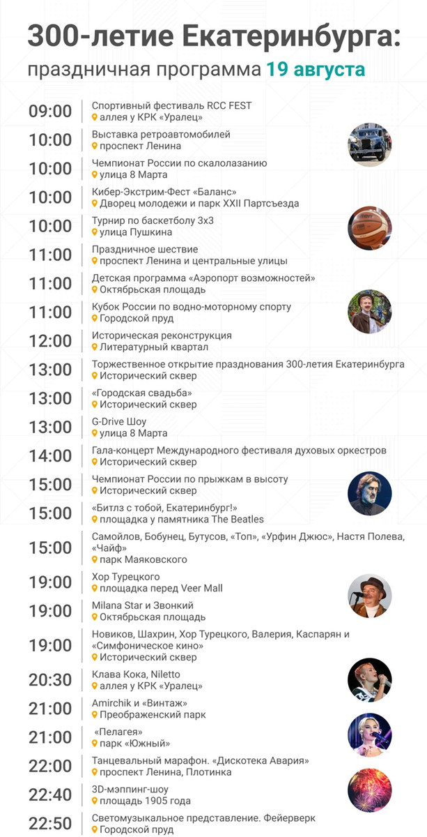 с 17 по 19 августа с 22.40 каждый вечер по 3-4 раза на фасаде здания администрации будут показывать аудиовизуальное шоу. Представление будет показано на Площади 1905 года Программа 17.08.2023: 1. Финал конкурса «Мисс Екатеринбург», пройдет он в Историческом сквере с 20:00 до 22:00, ведущим праздника объявлен Дмитрий Хрусталев. Тогда же выступит хедлайнер мероприятия – группа «Банд’Эрос». 2. Торжественное открытие Летней эстрады в Парке Маяковского, театр на 1200 мест будут открывать в 19:00. Выступать будет Денис Мацуев и Уральский академический филармонический оркестр. 3. День моды и стиля – стартует в 12:30 в Историческом сквере, продлится аж до 20:00, когда на той же площадке начнется конкурс «Мисс Екатеринбург». Выступать будет Игорь Гуляев. Программа 18.08.2023: 1. В 15:00 в Историческом сквере вынут капсулу времени, заложенную в 1973 году (тогда праздновали 250-летие Екатеринбурга и его впервые отмечали как День города). Тогда же заложат новую (временную) капсулу, предложения для