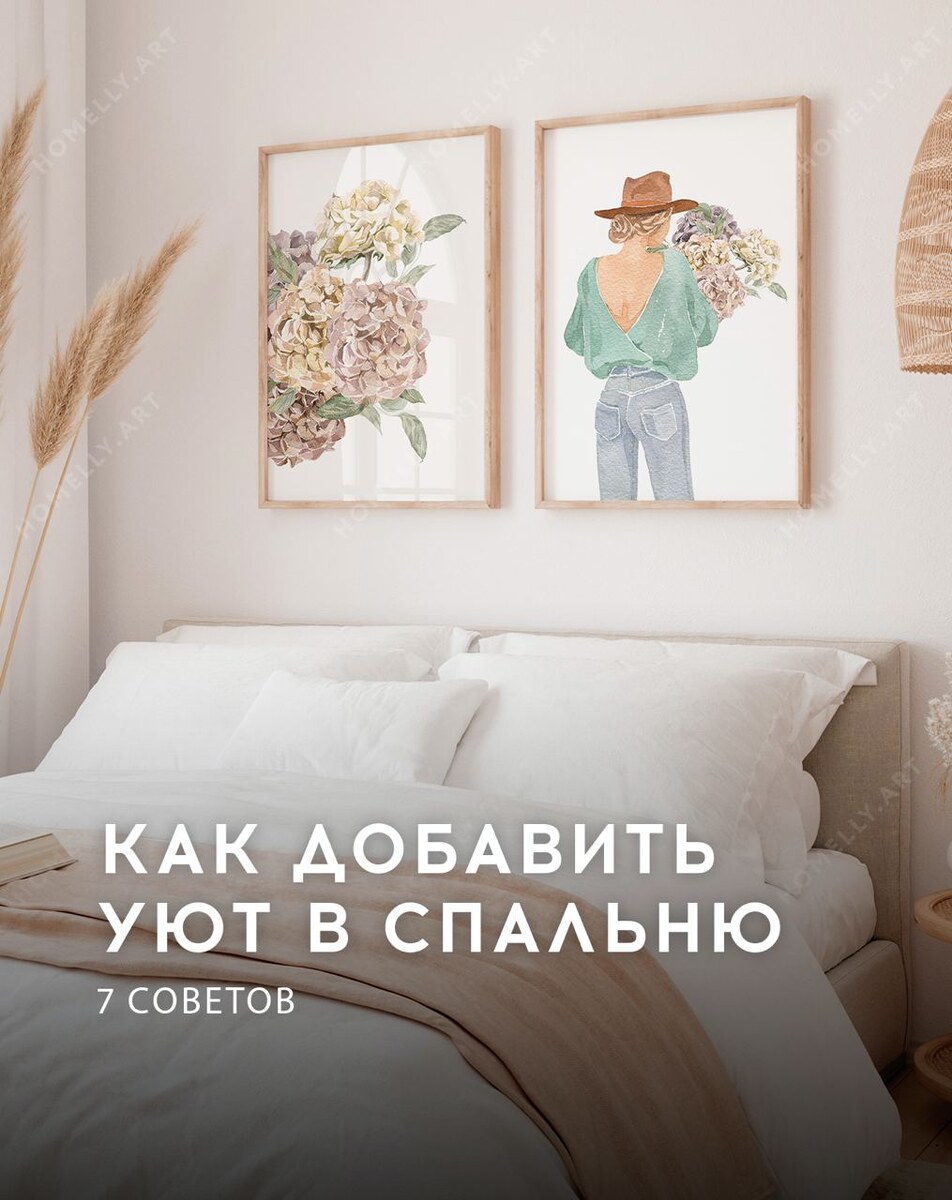 Примерно 26 лет нашей жизни мы проводим во сне! Поэтому важно сделать спальню уютной и комфортной. Советы от дизайнеров магазина с постерами: Это основа уютной спальни. Первый шаг - добавить пушистый ковер и качественное постельное белье. Также можно добавить уютный мягкий плед на кровать. Чем больше слоев, тем лучше! Композиция из двух или трех больших постеров, идеально подходит для размещения над кроватью. Постеры могут иметь акцентные цвета, что добавит изюминку в интерьер. Освещение в комнате влияет на атмосферу. Если у вас источник света со спокойным освещением, то все детали рядом будут восприниматься аналогично. Не стоит полагаться только на потолочный свет, т.к. он может сделать комнату менее уютной. Расставьте 3-4 точечных источника света по всей комнате и осветите темные углы, используя напольные лампы с рассеянным светом. Можно установить небольшую лампу на подоконник и прикроватные тумбы. На комод поставьте пару свечей или ночник, чтобы дополнить атмосферу уютом. Кровать –