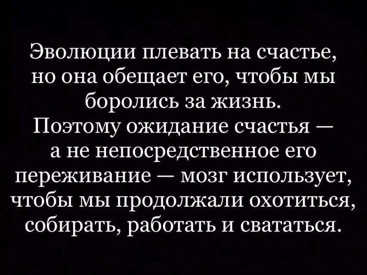 Эволюции плевать на счастье, но она обещает его, чтобы мы боролись за жизнь. Поэтому ожидание счастья — а не непосредственное его переживание — мозг использует, чтобы мы продолжали охотиться, собирать, работать и свататься.