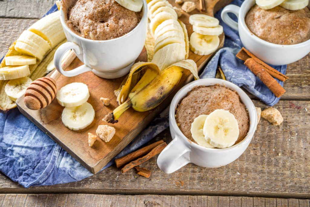 Этот рецепт бананового кекса - замечательный, вкусный и питательный вариант для завтрака, который состоит всего 5 ингредиентов и может быть приготовлен в микроволновой печи за считанные минуты. Ингредиенты: ½ банана, очень спелого; ¼ ч. ложки ванильного экстракта; 2 ст. ложки пшеничной муки; 1 ч. ложка сахара, по желанию; ¼ ч. ложки разрыхлителя теста; щепотка соли. (1 ч. ложка масла, на ваш выбор, по желанию, не обязательно) Дополнительные добавки (по желанию): мини-шоколадные капли, сахарные украшения, измельченные грецкие орехи и так далее