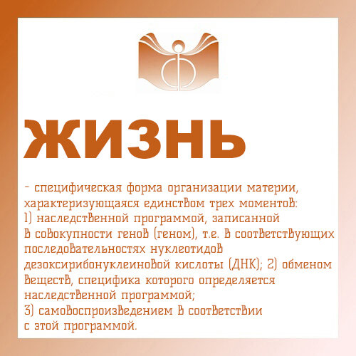 ЖИЗНЬ – специфическая форма организации материи, характеризующаяся единством трех моментов: 1) наследственной программой, записанной в совокупности генов (геном), т.е. в соответствующих последовательностях нуклеотидов дезоксирибонуклеиновой кислоты (ДНК); 2) обменом веществ, специфика которого определяется наследственной программой; 3) самовоспроизведением в соответствии с этой программой.