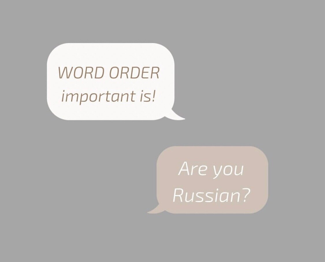 Даже улыбаясь :) 2 главных способа "спалиться" И без лишних предисловий начну прямо с первого. И это... 1. Говорить вот такими, очень, очень длинными предложениями, ведь иначе все богатство русской души не уместится, хотя ценность и гениальность высказываемой мысли не ограничишь и не сократишь; не зря сказал Тургенев: «нельзя верить, чтобы такой язык не был дан великому народу»... Думаю, с этим всё понятно, правда?) 2. Ну, а второй - это калькировать великий, могучий, свободный русский. Как в школе мы накладывали кальку, чтобы скопировать, так и в языке можно копировать, не осознавая того. И очень яркий пример - это порядок слов. Ведь ставим мы слова в предложении, конечно же так, как велит русская душа: то есть, как угодно. Только незадача: в русском нам так позволяют делать падежи, которых в английском нет. Как говорится, "не зная падежов, не говори глупостёв") Так что от чёткого порядка слов будет зависеть весь смысл сказанного. И порядок такой: Подлежащее (кто? что?), сказуемое