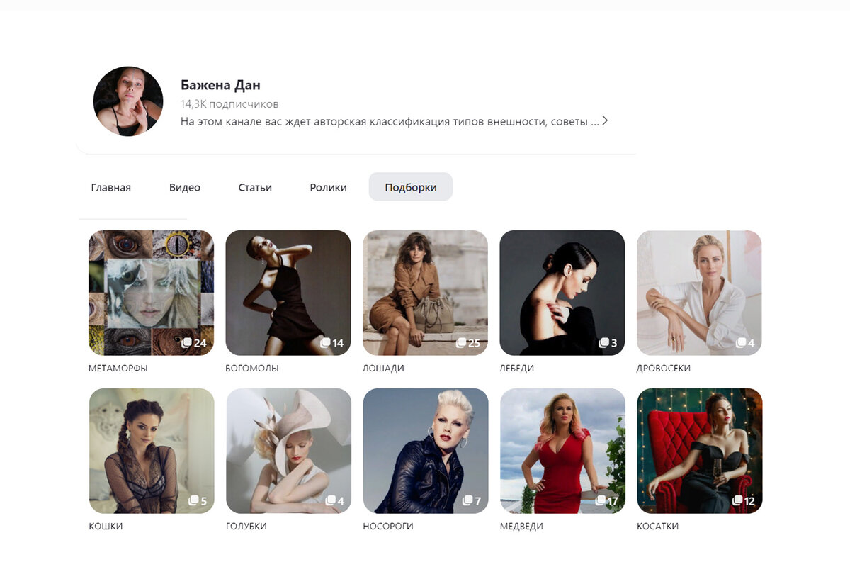Также можно зайти на главную страницу канала и смотреть типажи по подборкам: