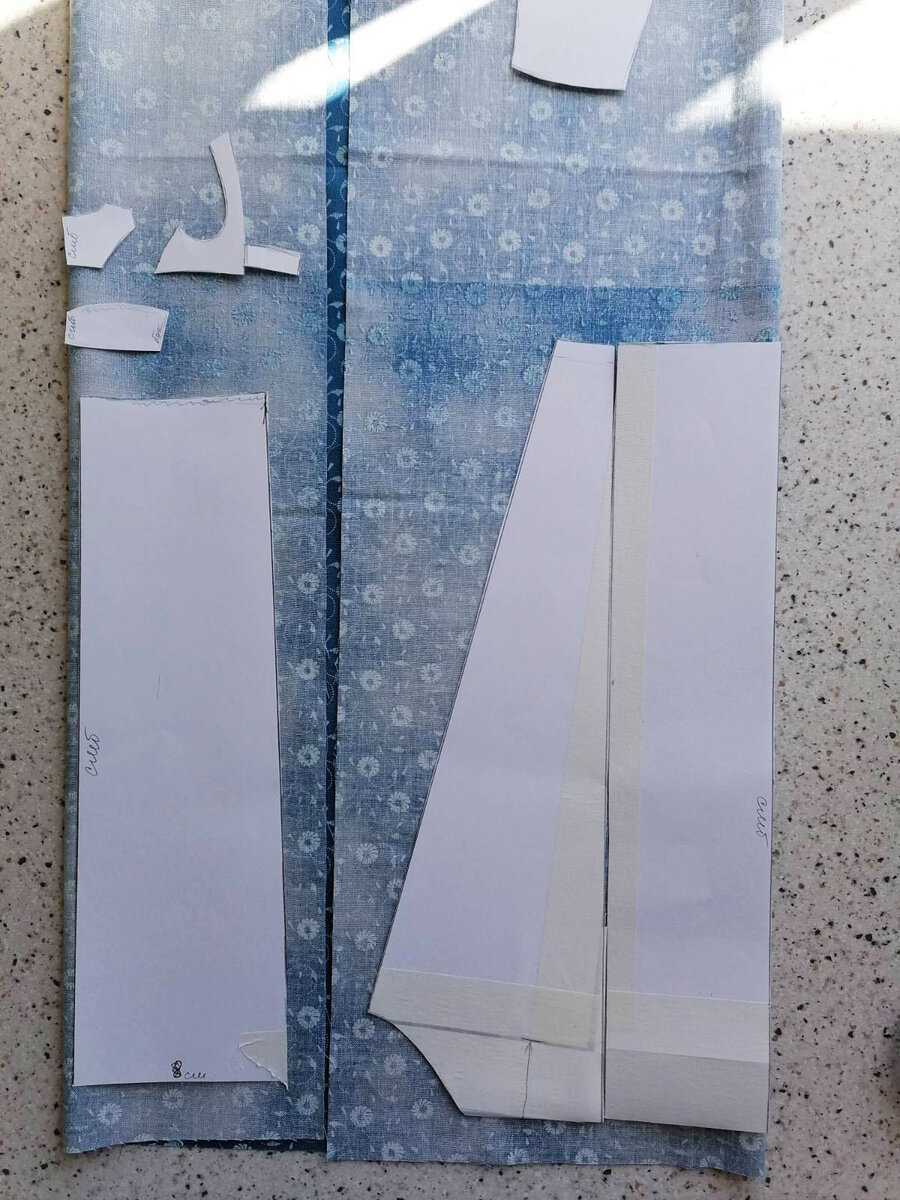 Раскроила детали. Обратите внимание, я решила прибавить со стороны сгиба по 0,5 - 1 см для большей пышности юбки и заодно показать вам как можно корректировать выкройку. Кстати, заднее полотнище я соединила с боковым и выкроила цельную деталь. Это тоже изменение. Переднюю часть лифа выкроила тоже с бОльшими припусками, потому что планирую обойтись без подкладки в этой части и, следовательно, придется делать обработку верха, а внизу пришивается пояс и нужен запас на подгиб. На полотнищах юбки тоже учитывайте запас на подгиб и обработку краев.