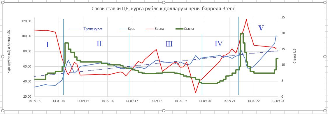 Давайте коротенько посмотрим в ретроспективе на последний скачок ставки ЦБ (ключевой ставки). Ведь, большое видится на расстоянии. С какой целью её корректируют? Официально: для борьбы с инфляцией. А её надо уничтожить или ужать до какого-то уровня? Смотрим на графики, которые я собрал по материалам открытых источников. За 10 лет попыток добиться поставленных целей не удалось ни разу. Снижению до чем-то приглянувшихся ЦБ заветных 4% не способствовали ни дорогие, ни дешёвые углеводороды, которые в целом определяют наполнение бюджета РФ. Лишь раз ставка ЦБ ненадолго приблизилась к такому порогу. На графиках явно выделяются 5 периодов. 1-й: заоблачные цены на нефть с устойчивым низким курсом рубля. Как только цена на нефть начала падать, курс полез вверх. Почему? Потому что бюджет экспортноориентированной страны грубо рассчитывается по формуле к*Б (к – коэффициент или курс своей валюты, а Б – цена главного экспортного товара). В случае РФ 43% доходов в бюджет обеспечивает нефтегаз. Ставк
