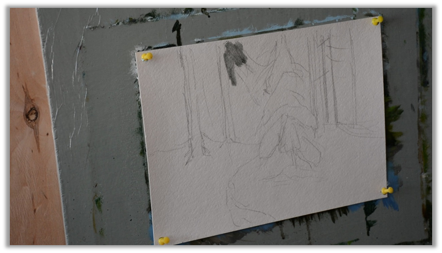 Данную работу я назвал «Зимняя сказка». Есть в этом сюжете что-то такое. Маленькая ёлочка на поляне возле вековых деревьев, всё укутано снегом… Но чего-то не хватало. И мне пришла в голову мысль добавить следы на снегу. Тропинка поворачивает возле нашей ёлочки и скрывается вдалеке. Всё-таки сказка — это какое-то действие. Пусть в этом пейзаже будет ощущение, что здесь кто-то был — то ли одинокий странник, то ли таёжный зверь…