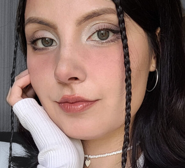 Наверное, мой самый любимый вариант, это макияж Douyin в Y2K эстетике. Для него характерно использование холодных оттенков в макияже глаз — голубые, серые, белые, синие, и, макияж губ в тёплых оттенках. Именно её я и выбрала для сегодняшнего урока. Попробую создать лёгкие смоки в дымчатых оттенках (да, да, для меня это смоки:D) и 3D макияж губ.