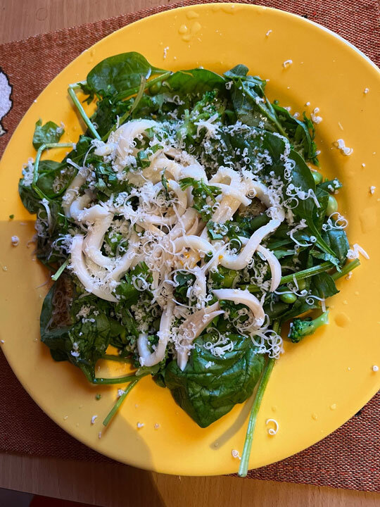 Вспомнила про зеленый салат с кальмаром, который ела в ресторане, и решила, что «можем повторить» :) Итак, приступим: ✓ Шпинат — 2 горсти