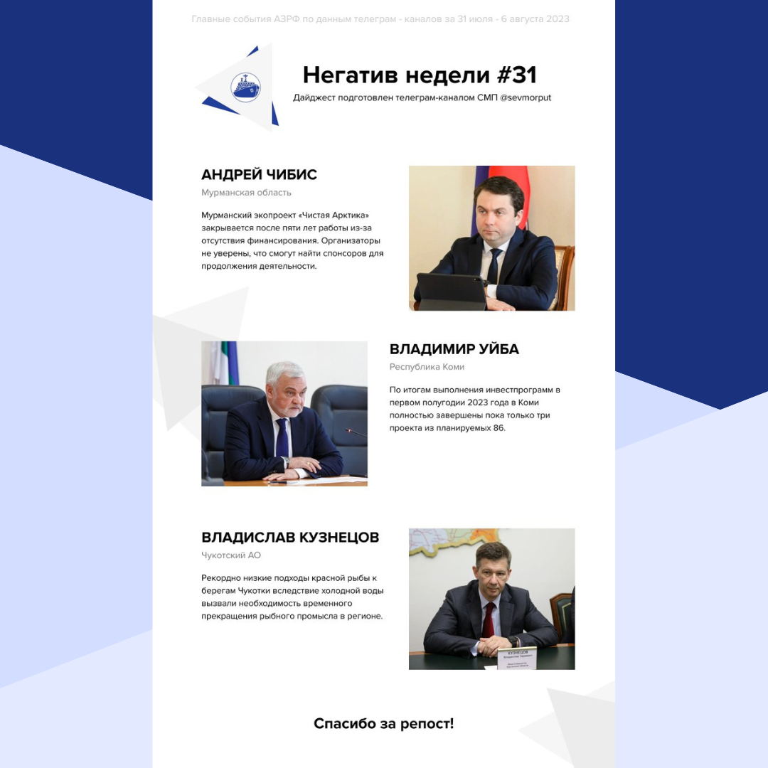 АНО «Чистая Арктика» прекращает свою деятельность в Мурманской области после пяти лет работы. Организацию создали в 2018 году с целью проведения экологических и просветительских мероприятий для северян: экоуроки, субботники. Причина прекращения работы организации в регионе тривиальна — отсутствие достаточного финансирования, необходимого для ее поддержания и развития. Закрытие проекта вызвало большой резонанс, однако организаторы не уверены, что смогут найти спонсоров для продолжения деятельности. Владимир Уйба