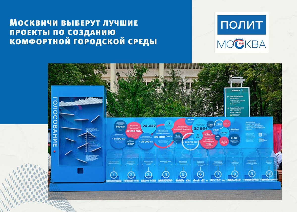 На территории олимпийского комплекса «Лужники», где проходит фестиваль городского хозяйства, установлена инсталляция с прозрачными колбами. Каждая из них символизирует один из аспектов жизни в городе: благоустроенные общественные пространства, парки и улицы, бесперебойное ресурсоснабжение, благоприятную экологическую обстановку и другие. Москвичи могут проголосовать, опустив шарик в соответствующую колбу. Таким образом, результаты голосования позволят определить направление дальнейших изменений с учетом пожеланий москвичей.