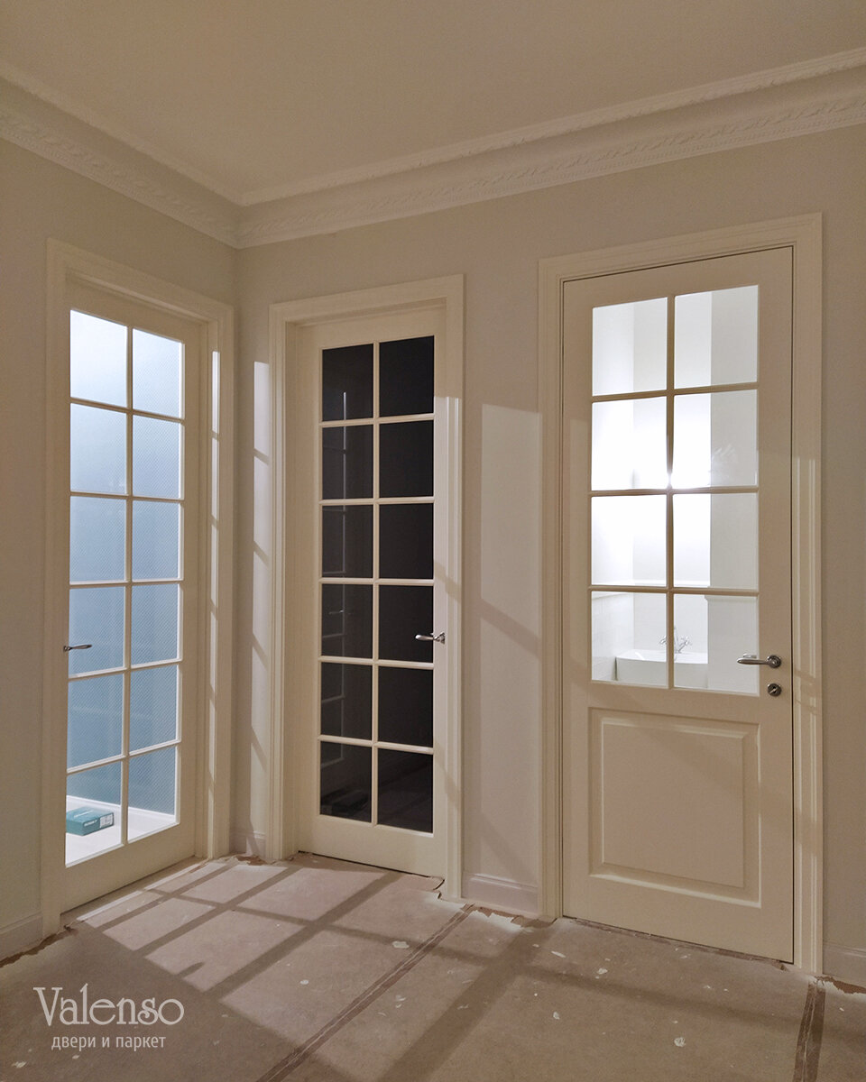 Мы довольно часто работаем с дизайнерами интерьеров, но также у нас есть и частные заказчики. Так получилось и в этом интерьере, где мы устанавливали двери. Заказчица периодически живёт во Франции, и она попросила нас воссоздать дизайн дверей по фотографиям французского интерьера. Что мы и сделали. В интерьере установлены двери разного типа и с разными видами полотен. Помимо стандартных глухих полотен в классическом дизайне с тремя филёнками, мы установили двери с полным и частичным остеклением в дизайне "английская решётка", а также двери с тремя секциями, две из которых статичные. Отличительной особенностью всех дверей является их нестандартная высота - 2300 мм. Полотна дверей окрашены в эмаль по палитре RAL. Мы установили итальянские скрытые петли OTLAV.