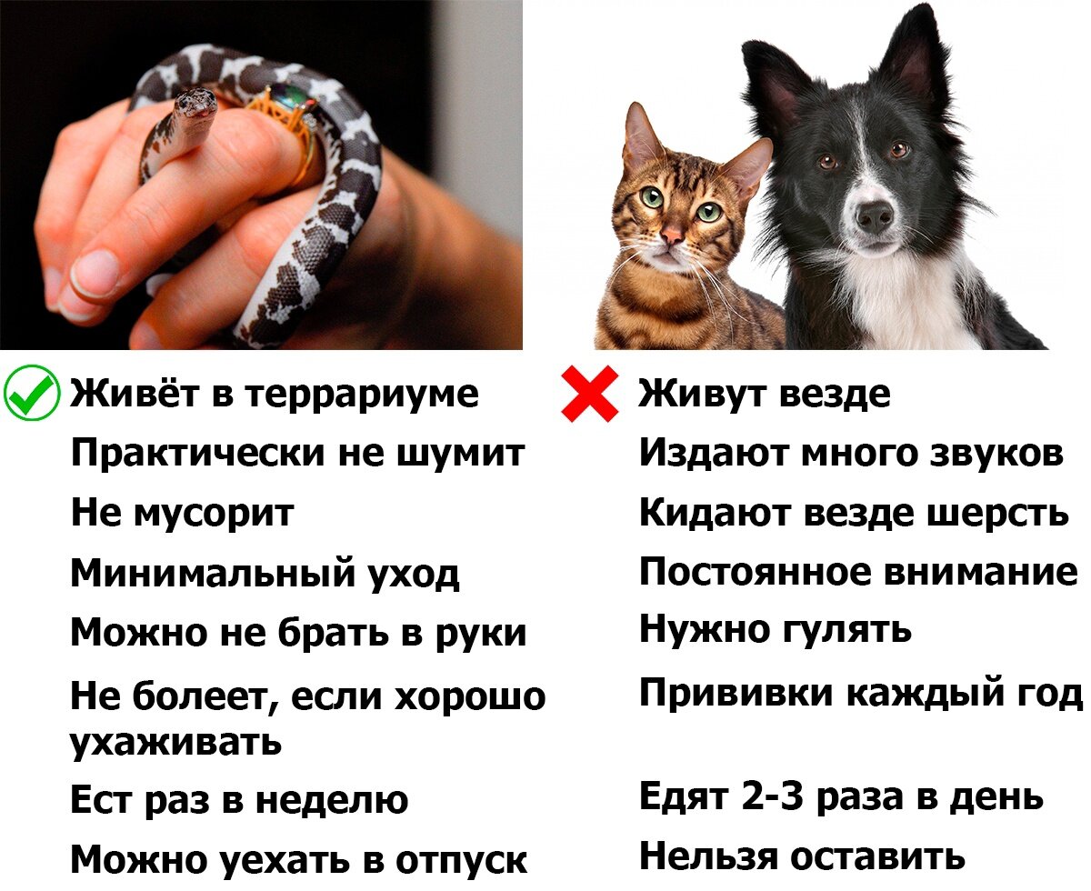 То, что написано на картинке выше - далеко не исчерпывающие факты. Но к ним следует отнести и один существенный минус: змея никогда не станет привязанной к своему человеку, как собака или некоторые кошки. Этот фактор может стать решающим в выборе домашнего животного.