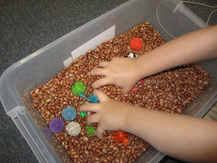 Жизнь современных детей пресыщена гаджетами и интернетом. Но нет ничего лучше пособий, которые мама может сделать в домашних условиях, и даже при участии самого ребёнка. Такая совместная деятельность способствует не только развитию и обучению ребёнка, но и эмоциональному сближению членов семьи. Мини-бассейн с мелкими предметами Как сделать: в прозрачный пластиковый контейнер положить мелкие предметы – камешки, игрушки из киндер-сюрпризов, скрепыши или динозаврики, которые часто дают в сетевых магазинах. Сверху засыпать крупой, манкой, рисом или песком.