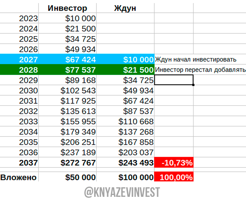 В тот момент, когда инвесторы-ждуны все же начнут вкладывать деньги, вы уже будете далеко впереди. И сможете даже вообще не инвестировать, а сам капитал сделает всю работу за вас!📊😎