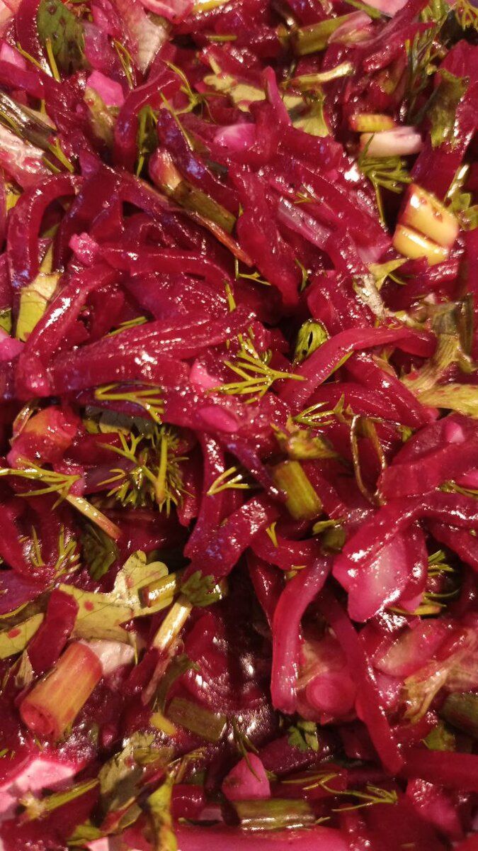 Самое интересное что мысль приготовить такой завтрак возник сразу после пробуждения, У меня такое редко бывает, но бывает. И так мне пришла мысль приготовить изначально свекольный салат. Накануне я купила в Перекрестке пакет варенной свеклы,порезанной соломкой, мне показалось что пора бы разнообразить свой рацион, потому что в нем мало овощей и вообще салатов. Я подумала что немного жаренного лука и чеснока как раз подойдут к свекле(сырыми я их есть пока не могу, увы), если честно я свеклу не очень люблю и покупаю крайне редко, хотя все кругом говорят о её полезности, но я как то редко всё равно её ем. Я почистила одну луковицу и три зубчика чеснока,пожарила лук и в самом конце,после выключения тепла закинула туда мелко порезанный чеснок. Выложила из пакета свеклу и стала добавлять туда жаренный лук с чесноком. А потом меня понесло, я вспомнила что у меня еще есть зелень укропа,кинзы и филиса. Раз вспомнила, решила что оно не помешает а наоборот будет полезно в этом салате. Всё порезав