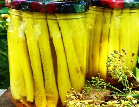 2. Подготавливаем банки: берем баночки, промываем их хорошенько содой, обдаем кипятком, высушиваем. 3. На донышко каждой банки кладем семена укропа, разрезанные дольки чеснока и 1 ч.л.горчицы в зернах. Выкладываем подготовленные дольки огурцов в каждую банку и заполняем их полностью.