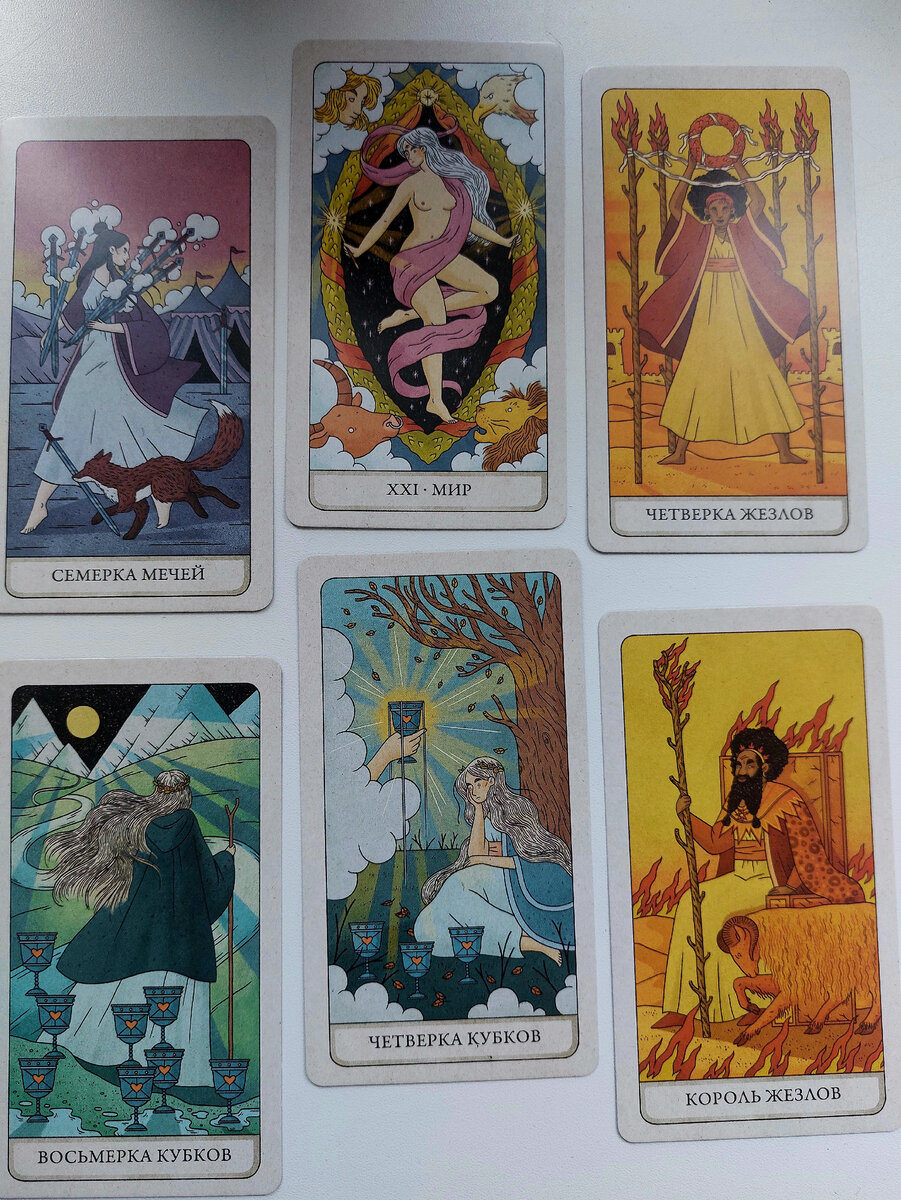 Карты раскладываем в произвольном порядке. К вопросам сразу напишу карты которые вышли у меня. 1. Какой человек по характеру? - 7 мечей 2. Каким человека видит его общество? - Мир 3. Что нравится окружающим людям в нём? - 4 жезлов 4. А что не нравится? - 8 кубков 5. Сильные стороны человека? - 4 кубков 6. Слабые стороны человека? - Король жезлов Теперь толкуем, расклад был сделан на меня мной) Какая я по характеру? 7 мечей. Всегда на несколько шагов продумываю каждое действие. Аккуратна и стратегична, умею выходить из любых ситуаций с наименьшими для себя потерями, или не обращать на них внимания вообще. Я разбирала эту карту называя таких людей хитрожопыми, получается, это что я хитрая жопа?🥲 В минусе это двуличие и манипуляции людьми в своих целях, с двуличием я согласна, я по знаку зодиака близнецы, постоянно мечусь из стороны в сторону, поэтому минус тоже проявляется, это замечаю. Пользуюсь ли я манипуляциями в своих интересах? Да я бы не сказала. Пользуюсь ли я на всю катуш