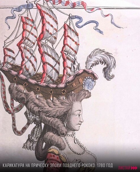 …Прическа в виде сражающихся солдат – дама желает показать, что преисполнена мужества. Прическа в виде мельницы и фермы с крошечными коровами, пастухами и пастушками — эта дама — мечтательница. Прическа в виде дуэли: два миниатюрных кавалера на голове дамы поражают друг друга шпагами — дама кокетливо выставляет напоказ свои успехи.