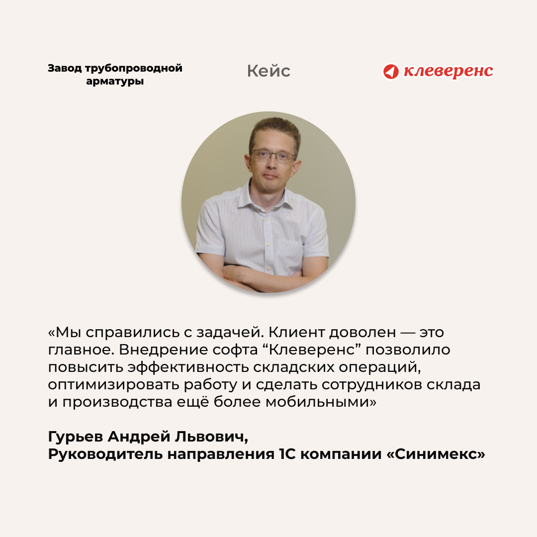 Необходимость обеспечить оперативность и контроль товародвижения на складе и в производстве подтолкнула директора завода трубопроводной арматуры к переходу на новую систему учёта и обновлению конфигурации софта «Клеверенс». Это позволило повысить эффективность складских операций, оптимизировать работу и сделать кладовщиков и сотрудников производства ещё более мобильными. Проект выполнил интегратор — компания «Синимекс».
