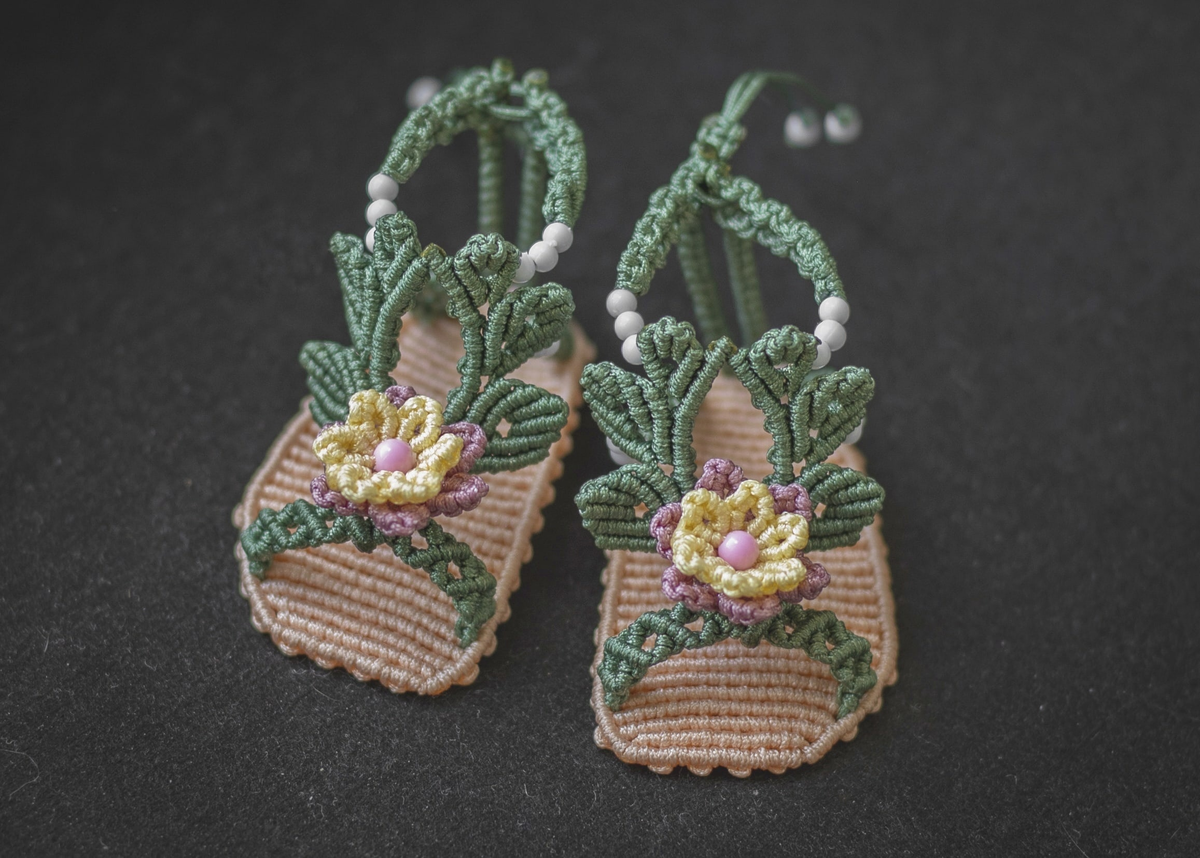 Вообще с обувью у меня очень сложные отношения, я не очень люблю её плести и зачастую бывает так, что образ уже готов и сфотографирован, а обувь ещё не сплетена) это работает только в том случае, если платье длинное