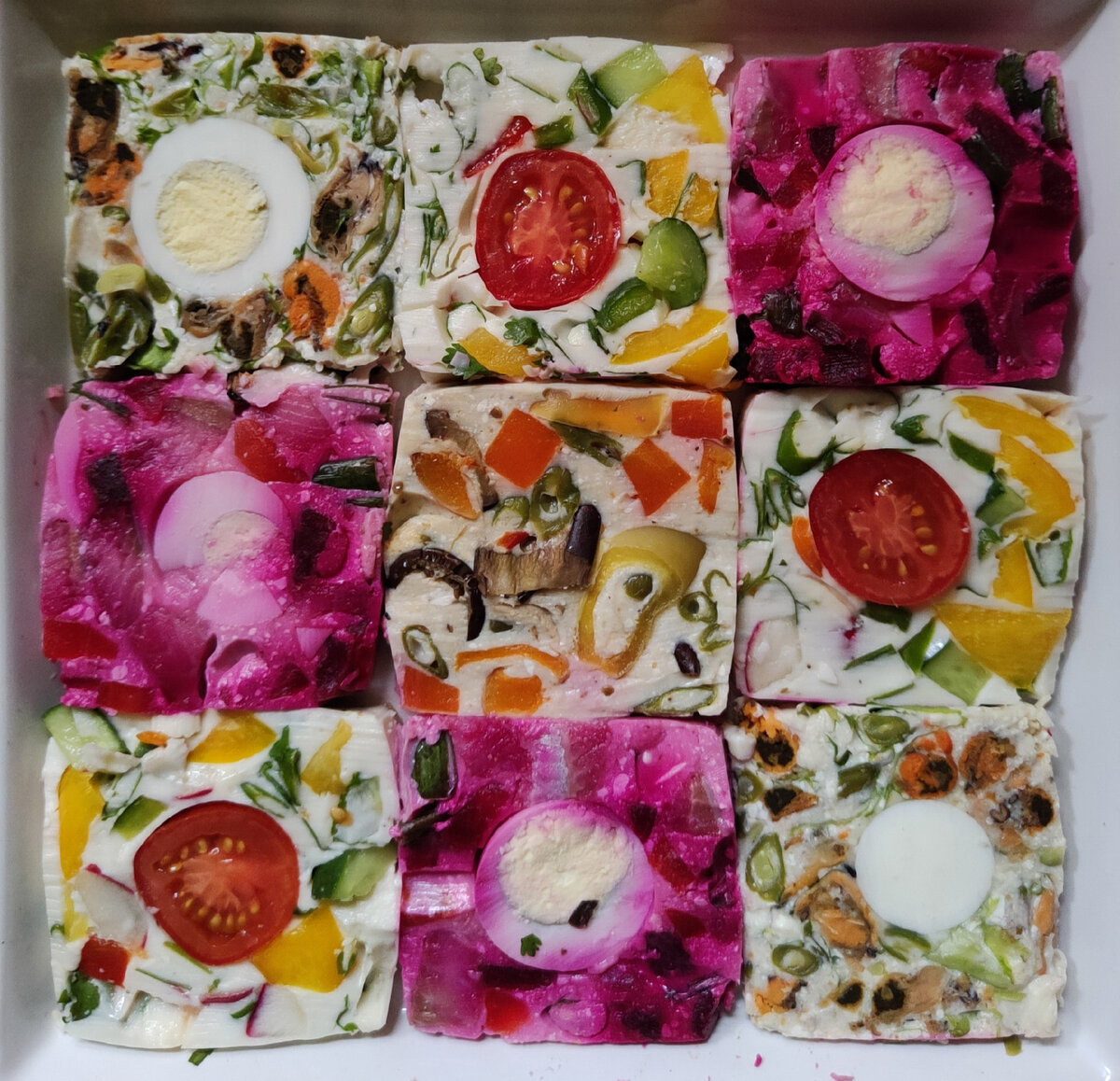 Приветствую вас! Сегодня продолжим тему холодных закусок на основе творожного желе. В качестве заливки использовала смесь творога 5%, греческого йогурта 2% и термостатной простокваши (все по 1/3), немного зернистой горчицы, готовой смеси хрена с васаби, сухих приправ. Все ингредиенты взбила в блендере и добавила подготовленный быстрорастворимый желатин. Начинка к этому времени уже должна быть готова. Сварить яйца вкрутую и очистить. Зелёную стручковую фасоль потушить до полуготовности, добавить мидии и готовить ещё минут 7-10. Остудить. Зелёный салат и рукколу мелко нарезать и смешать с фасолью и мидиями. Высыпать начинку в смесь желе и хорошо перемешать. В форму (пакет Тетра пак) на дно выложить немного смеси, в центр вертикально поместить яйцо и заполнить вокруг него смесью , уплотняя ложкой. Если форма высокая и яиц несколько, повторить порядок действий. Убрать в холодильник для застывания. Прекрасный лёгкий вариант обеда или ужина (здесь ещё и "кирпичик" желе с запеченными овощами)