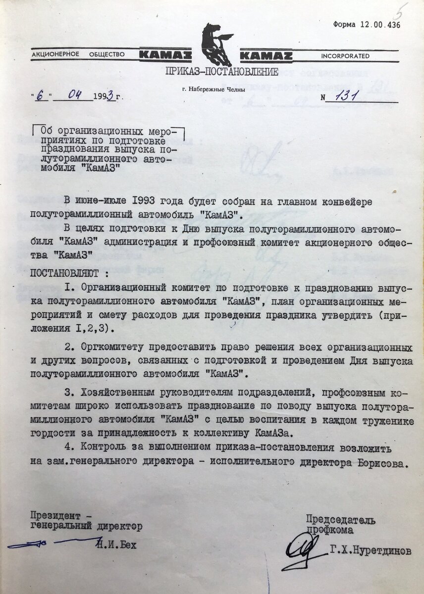 10 августа 1993 года на главном сборочном конвейере был изготовлен 1 500 000 грузовик. Это событие произошло после пожара на заводе двигателей. Фотографий с этого события не сохранилось. Возможно, по причине трагедии, празднества вовсе были отменены... Но в Музее КАМАЗа хранятся два документа, посвящённые выпуску юбилейного автомобиля. Внизу приказ-постановление №131 от 6 апреля 1993 года «Об организационных мероприятиях по подготовке празднования выпуска полуторамиллионного автомобиля КАМАЗ». И публикация из газеты «Вести КАМАЗа» того периода. Внизу фотографии, сделанные в 1990-х годах на главном сборочном конвейере КАМАЗа. До выпуска 2 000 000 автомобиля КАМАЗ оставалось ещё долгих 19 лет...