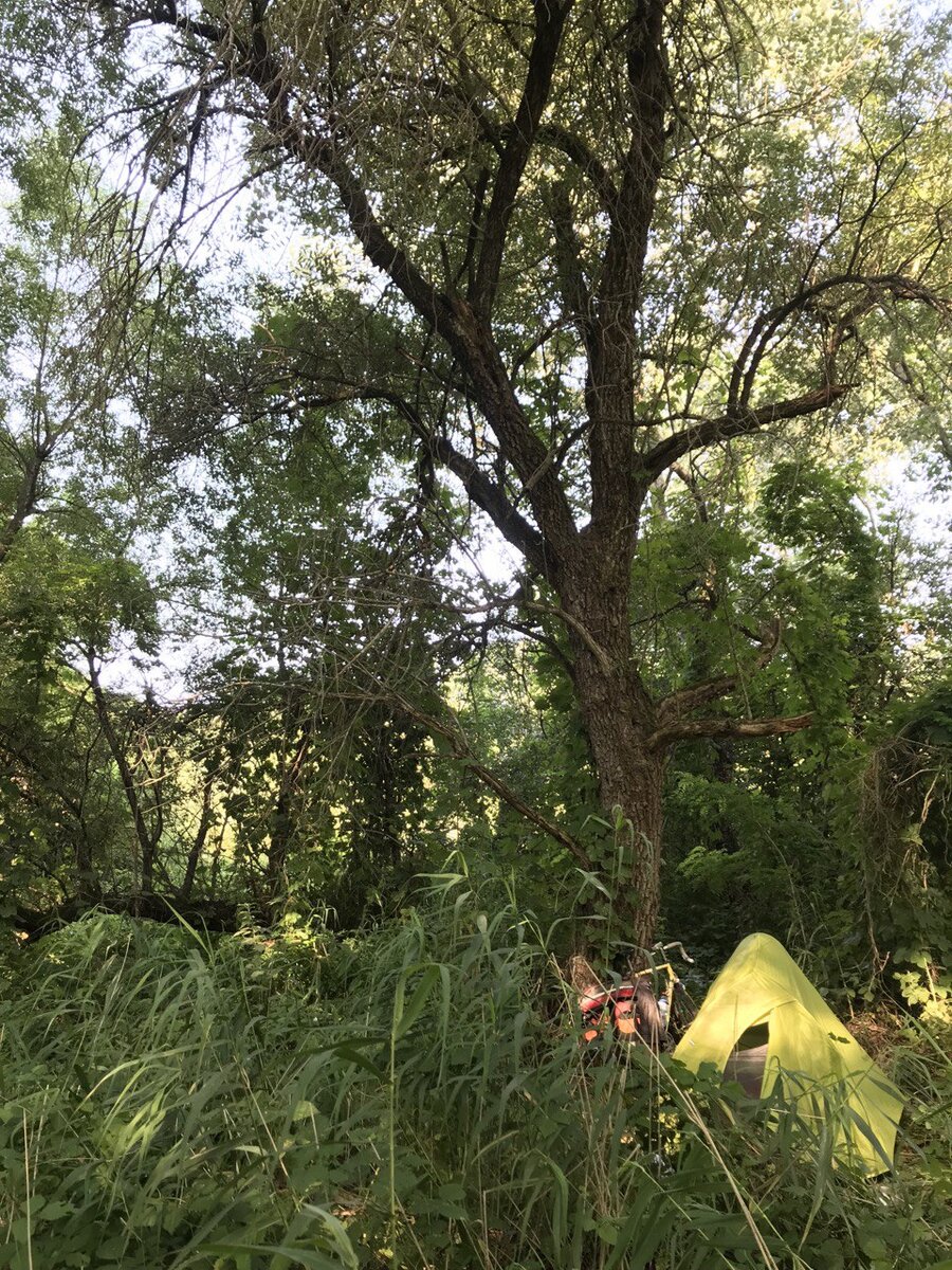 На неделе повторно заночевал на довольно быстрой реке Подкумок. Утром сзади прям у палатки заприметил беловатый, явно не подходящий по фактуре предмет. Это был мёртвый, уже остывший птенец. Откуда он взялся так и не смог понять. Следов насилия не увидел. Возможно упал с дерева, но с вечера предостерегающих криков родителей не слыхал. Ночью, пока не спал тоже вроде ничего не падало. Просто не хотелось бы быть причиной беспокойства и ненужной смерти. Если свалился с того огромного дерева на мягкий тент, думаю бы выжил. Осмотр дерева и наблюдение не дали признаков гнезда - дупло, следы помёта, писк и другое отсутствовали. Как вариант, другой хищник мог просто выронить этого птенца. Знакомый специалист по птицам предположил что это птенец сплюшки. Утром на коньке палатки меня поджидал клещ. После снимка он незамедлительно улетел в сторону от щелчка пальца. Позже рядом с деревом с которого предположительно упал птенец, увидел уже пустующее крохотное и уютное гнездо какой-то небольшой