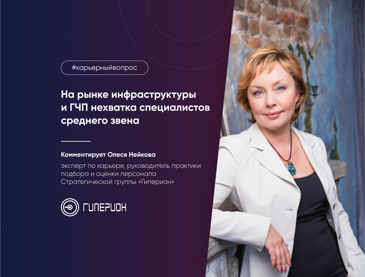 Руководитель практики подбора и оценки персонала Стратегической группы «Гиперион» Олеся Нейкова дала комментарий по просьбе Давыдов.Индекс к статье РБК о том, каких кадров не хватает в инфраструктурных и промышленных отраслях: «Должна отметить, что нехватка кадров существует сейчас не только в промышленности. Я много лет занимаюсь рекрутингом, последние 6 лет — точечным поиском специалистов и руководителей для крупных инфраструктурных проектов, реализуемых через концессии и ГЧП по всей стране. Традиционно лето, а особенно июль и август — мёртвый сезон для поиска работы или кандидатов. Но лето 2023 года оказалось очень динамичным: все вокруг ищут персонал. На нашем рынке основная нехватка в специалистах среднего звена с опытом 2-7 лет, а вот кандидатов-руководителей сейчас переизбыток. Это связано с требованиями к специфическому опыту реализации проектов на основе государственно-частного партнёрства. Кандидаты, которые действительно имеют профильный опыт, быстро растут, и заниматься год