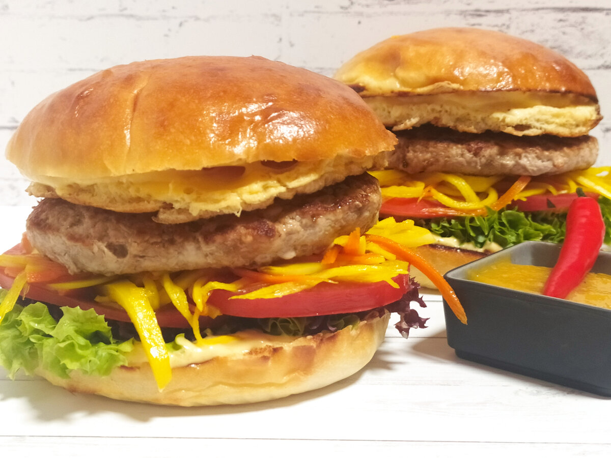 Филиппинские бургеры "chori" - блюдо филиппинской кухни, состоящего из сладкой котлеты, приготовленной из фарша для колбасы лонганиза (разновидность чоризо); маринованного салата из зеленой папайи "atchara"; соуса на основе бананового кетчупа; листьев зеленого салата и помидор. булочки для бургеров - 3 шт.