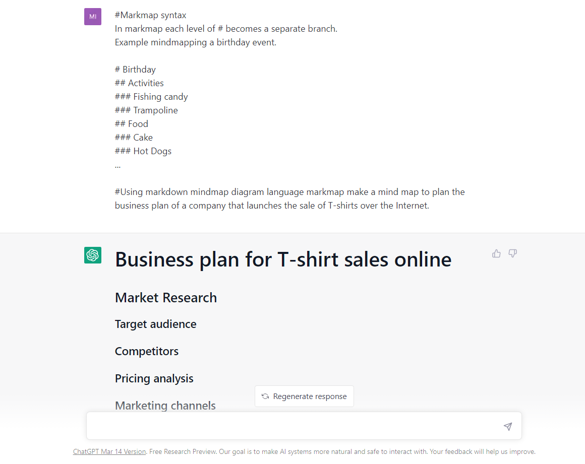 #Using markdown mindmap diagram language markmap make a mind map to plan… (сюда нужно вписать то, зачем вам нужна интеллект-карта). Я для примера попрошу сгенерировать бизнес-план для компании, которая хочет запустить продажу футболок через интернет: