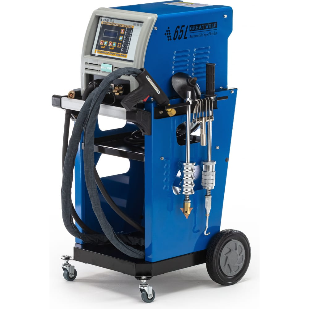 Great Wolf – популярный производитель оборудования для автосервисов. Большим спросом пользуются споттеры для кузовного ремонта. Сегодня расскажем о наиболее популярных моделях споттеров Great Wolf. Споттер GW 65L 220 Компактная модель с высокими техническими характеристиками. В комплекте идет тележка для споттера и большое количество инструментов и расходных материалов: -обратный молоток (короткий) - обратный молоток (длинный, с ручкой) - крюк на обратный молоток, - насадка под треугольник, - электроды карбоновые, - присоска пневматическая, - масса сварочная, - гребенка с шестью зацепами, - ключ разводной, - проволока волнистая, - кольца скрученные для вытягивания, - кольца тяговые (шайбы), - электрод для волнистой проволоки, - электрод для тяговых колец, - электрод для болтов, - электрод для осадки метала, - держатель электрода, - электрод для колец, - треугольник омедненный, - болты омедненные. Этот споттер оснащен тележкой с поворотной парой колес, поэтому его легко перемещать по ав