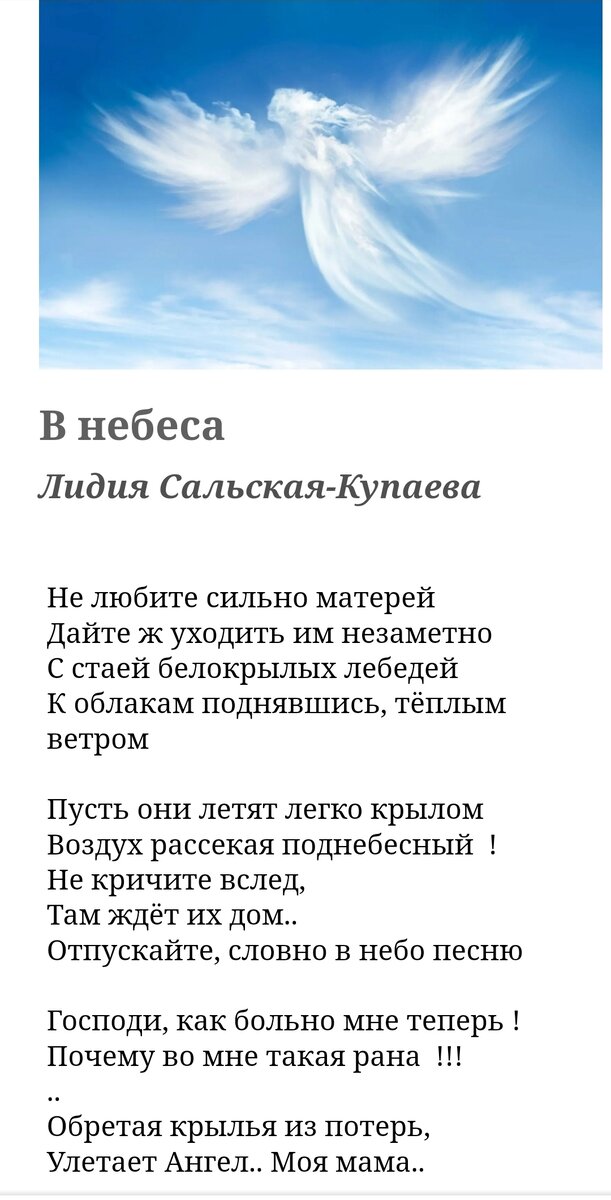 Сейчас слушала песню "Молитва" В исполнении Сергея Чумакова.. Слова, голос, исполнение, всё меня словно пробивало насквозь, душу наизнанку и огнём.. Не знаю почему.. У меня возникли эти мысли. Я боюсь уйти в другой мир только потому, что мои дети, уже совершенно взрослые, не захотят отпустить меня.. Я очень сильно любила и люблю свою маму.. Она давно не со мной, а там, за облаками.. А это , как взрыв вселенной..