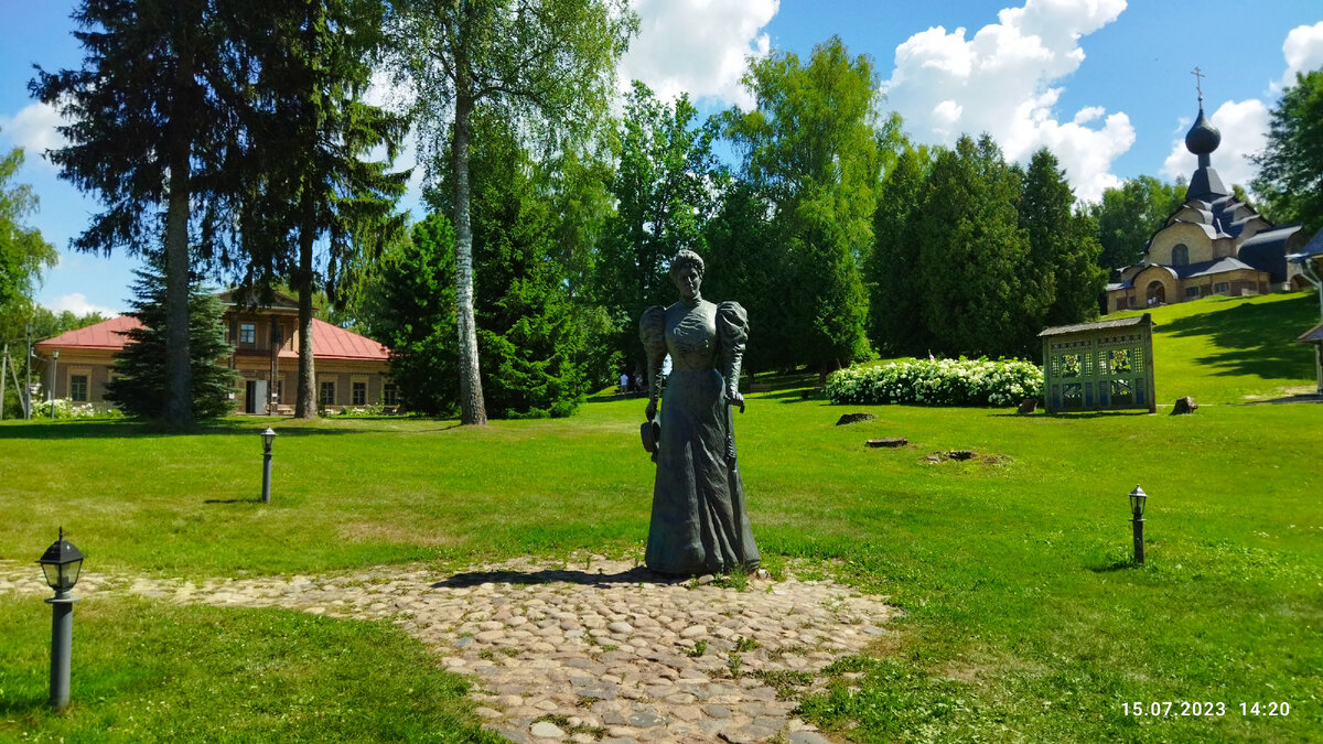 Посетителей «встречает сама» Мария Тенишева на зеленой полянке в окружении всех построек – Теремка, Храма и школы.