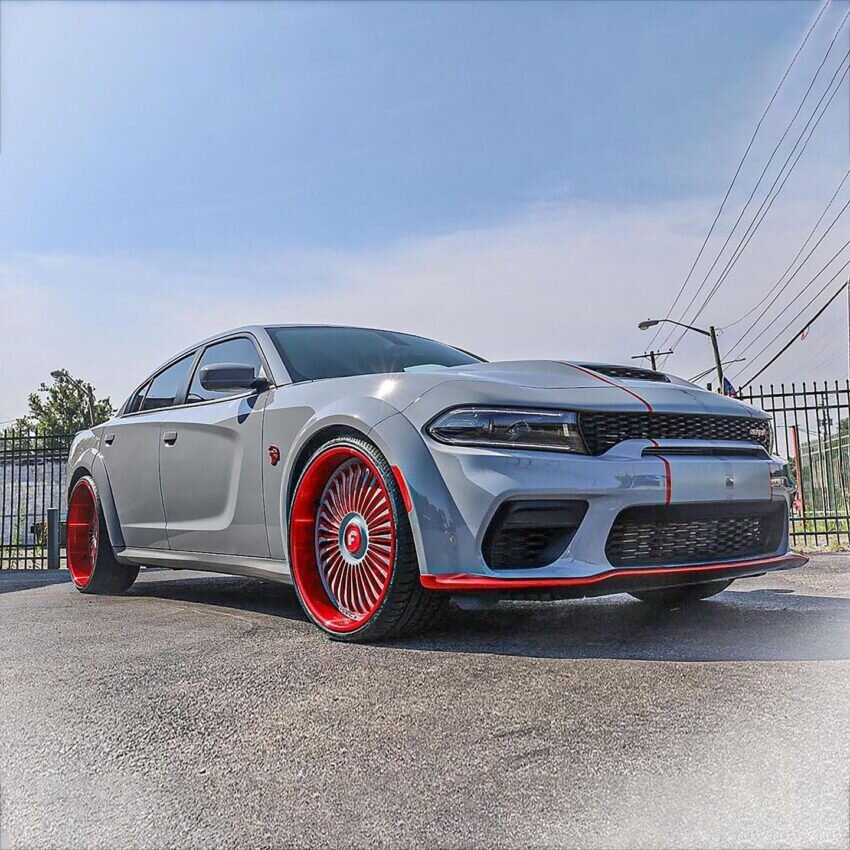 Серый Dodge Charger Jailbreak 2023 года новым дизайном Forgiato Multato, и теперь Redeye шикарно ездит на 24-дюймовых колесах вторичного рынка. Они с яркими малиновыми акцентами для немного возмутительного контраста. Конечно, красные детали могут не всем понравиться. Но для тех, кто ценит их, кажется, что кастомные Mopars имеют особенность с контрастной красной окраской. Второй вариант, оснащение черно-красного Dodge Challenger Hellcat также на 24-дюймовые колеса Forgiato.