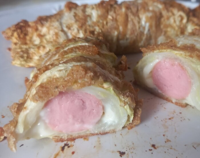Когда любишь сосиски в тесте, но есть их тебе нельзя, то начинаешь заниматься экспериментами. Куда бы сосиску завернуть? В Капусту? А почему бы и нет? Погнали! Так, что тут у нас? Вареные сосиски, листы пекинской капусты, панировка из сухарей с клетчаткой, плавленный сыр, взбитое венчиком яйцо. Отлично, все что нужно. Яичко, присаливаем и приперчиваем, взбиваем венчиком Серединки листьев капусты отбиваем молоточком, чтобы стали мягкими Присыпаем капусту панировкой Выкладываем на лист пластик сыра, сосиску и сворачиваем в рулетик Рулетик обмазюкиваем в яйце И жарим рулетики на сковороде на растительном масле (можно с добавлением сливочного) Не плохо так получилось. Вполне себе перекус.