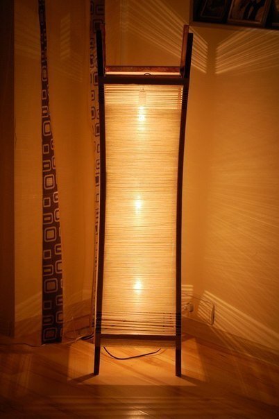 Ход работ: 1. Берем рейки и скрепляем их поперечными перемычками в двух местах. 2.Красим конструкцию 2 раза морилкой и после высыхания трем шкуркой для создания эффекта состаривания. 3.Затем делаем подводку к лампам, начиная сверху (см.фото). Желательны использовать керамические цоколи. 4.Затем наматываем льняную нить по кругу. Для создания изгиба реек нить нужно натягивать, а если изгиб не нужен, то мотать не очень плотно. Напольная лампа будет интересно выглядеть на балконе, веранде, холле, под лестницей. В спальне или детской создаст камерное уютное освещение перед сном.