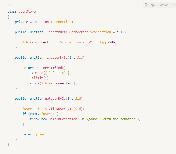 Для полного понимания темы, советую прочитать статью про stores На мой взгляд кидать исключения нужно в методах store, это избавит вас от одинаковых проверок в коде на пустоту ответа, который вернул тот либо иной метод store. И так, для себя я принял следующий стандарт в организации нейминга методов store : — Если мне нужно чтобы метод вернул просто пустой результат, то такой метод будет иметь префикс find. Например: findUserById(int $id) — Если мне нужно чтобы метод выкидывал исключение, при получение пустого результата запроса, то такие методы будут иметь префикс get. Например: getUserById(int $id) Используя такой простой способ организации имен, я всегда понимаю, пройдя беглым взглядом где, что возвращается в результате запроса.