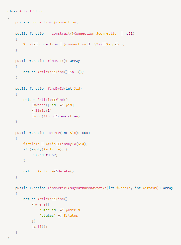 Для полного понимания темы, советую прочитать статью про stores Простой пример. Есть ArticleStore: И тут возникает необходимость чтобы все запросы возвращали только статьи у которых свойство is_delete было равно 0; Дабы не дублировать условия во все методы я всегда создаю в store метод baseQuery, который возвращает базовый запрос, который будут использоваться все остальные методы этого store .