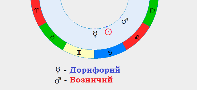 Кроме Восходящего Знака и ASC, и - положения Солнца в Знаке. "Обстоятельство" это называют Дорифорий и Возничий. То есть, 😄, "их - два" но в "одно" они связаны Солнцем. Относительно которого располагаются. Один (Дорифорий) стоит сразу перед Солнцем, то есть это именно ближайший к Солнцу объект пЕред ним. Возничий, соответственно, это который сразу за Солнцем идёт, ближайший. А это вот пример Дорифорием и Возничим, считается, что не могут быть Фиктивные Планеты, математические точки и Астероиды. Чёрная Луна (Лилит), Селена, Лунные Узлы (Северный и Южный). Но! они тоже учитываются и вносят в характеристику "мистику и карму", то есть тоже "некоторым образом описывают положение дел". Вроде как в случае, если нет реальных Планет или Луны, то тогда "да, можно" - иметь это ввиду. Бывает, что Дорифорий или Возничий "отсутствуют", находясь довольно далеко, за пределами градусов 60-90. Бывает что и 180 Но кто-то из них один - да обязательно есть! А просто за счёт того, что Венера и Меркурий н