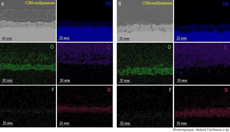 Ученые Института химии Дальневосточного отделения РАН разработали гибридное защитное покрытие, позволяющее контролировать скорость деградации временных имплантатов на основе магния. Со временем ученые надеются создавать полностью 3D-печатные, растворимые, персонализированные металлические имплантаты. Изображения гибридных покрытий, пропитанных олеатом натрия и поликапролактоном в различных концентрациях, и распределения элементов по толщине защитных слоев Модифицированный слой из оксида магния, соли органической кислоты омега-9 и биоразлагаемого полимера замедлил разрушение металла от коррозии в шесть раз и обеспечил контролируемое растворение материала. Изобретение поможет костям правильно срастаться после сложных переломов и избавит пациентов от повторных операций по извлечению конструкции, сообщает пресс-служба Российского научного фонда. Временные имплантаты в виде пластин, винтов или сеток используют при лечении сложных переломов, когда требуется надолго зафиксировать кости в прав