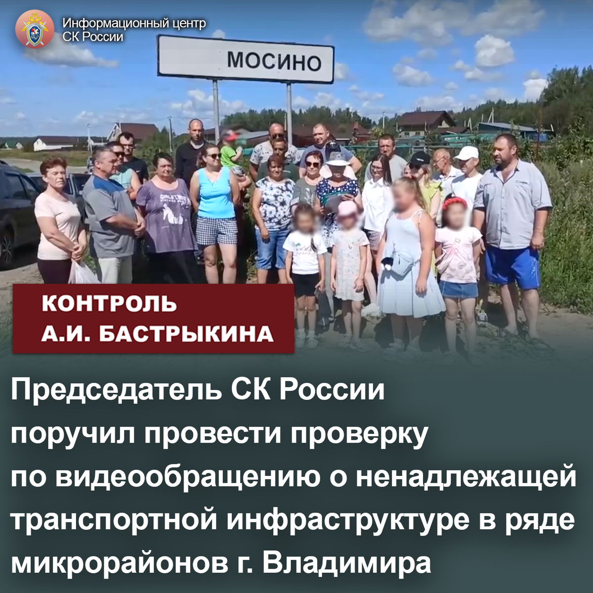 Председатель СК России поручил провести проверку по видеообращению о ненадлежащей транспортной инфраструктуре в ряде микрорайонов г. Владимира В социальной сети размещено видеообращение жителей села Мосино, микрорайонов Юрьевец, Оборино, Спасское и Немцово муниципального образования «город Владимир» о ненадлежащей транспортной инфраструктуре. Автомобильная дорога, соединяющая областной центр с указанными отдаленными микрорайонами, где проживает большое количество пенсионеров и многодетных семей, разбита, автомобили и общественный транспорт вынуждены передвигаться по обочинам, что влечет их поломку. Неоднократные обращения граждан в администрацию результатов не принесли. Председатель Следственного комитета Российской Федерации Александр Иванович Бастрыкин поручил руководителю СУ СК России по Владимирской области Артему Александровичу Кулакову провести процессуальную проверку по озвученным в видеообращении доводам и представить доклад о ее ходе и результатах. Исполнение поручения, а такж