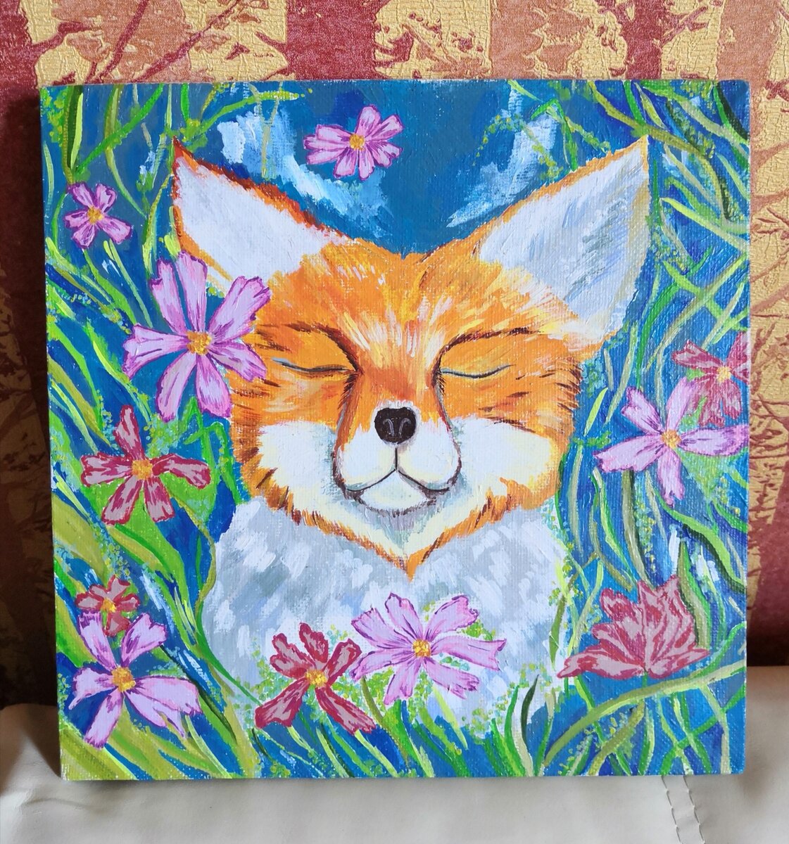 Моя самая любимая милая рыжуля, которая зажмурила глазки от удовольствия и нюхает цветочки! Эту картину я рисовала маме в подарок. Холст, акриловые краски. Сначала она висела на одной стене, потом после перестановки начала менять свое место жительства, и сейчас она находиться в ожидании нового места! Яркая и сочная картина, совсем не подходящая под интерьер, но сильно поднимающая настроение и радующая глаз!