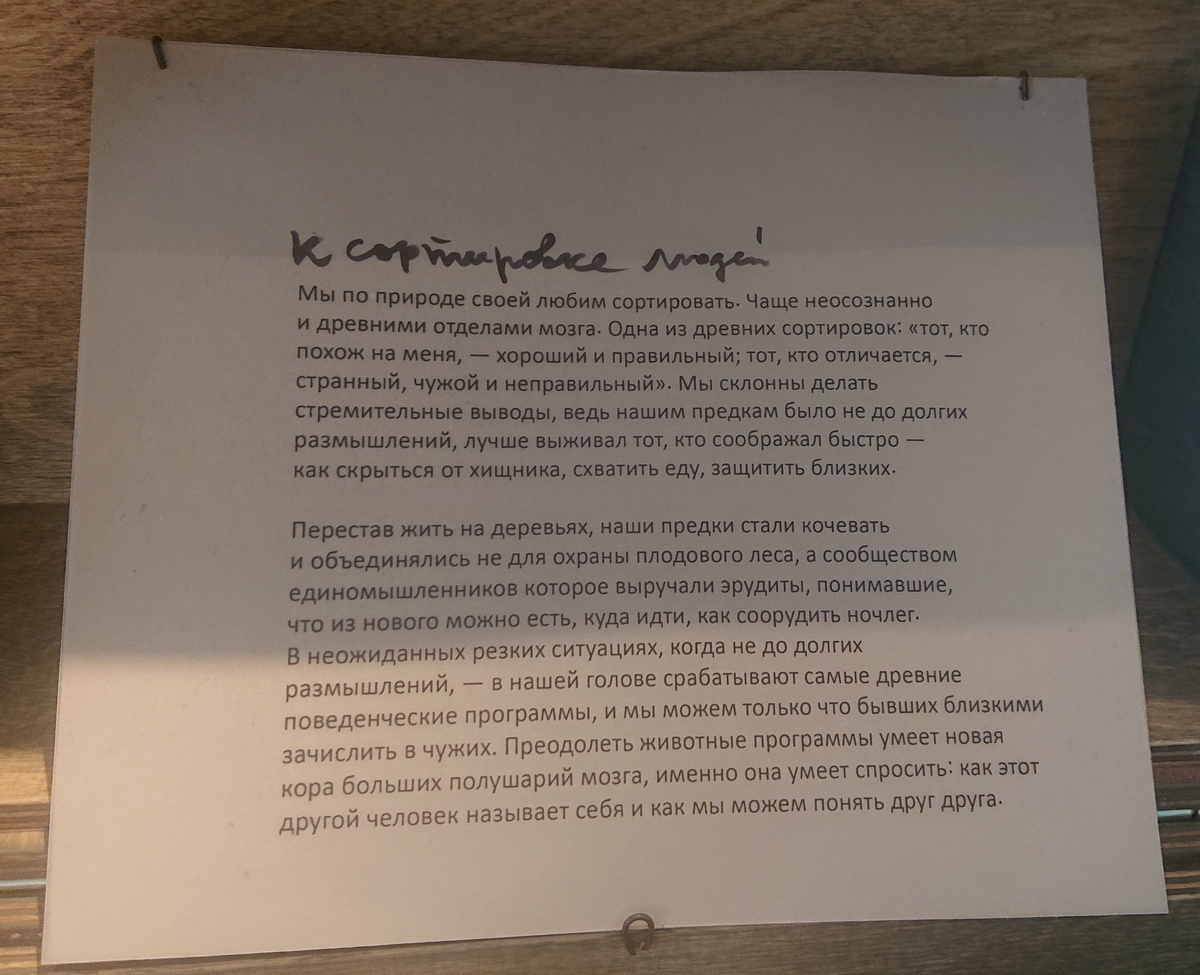 7. Отсутствие чёткого сценария посещения - есть точка входа и условного выхода, остальные сведения ты можешь собирать сам в любой последовательности и в любом объёме, погрузиться во все истории за раз необязательно. Мне даже кажется, что вокруг каждого сюжета можно построить отдельную выставку.