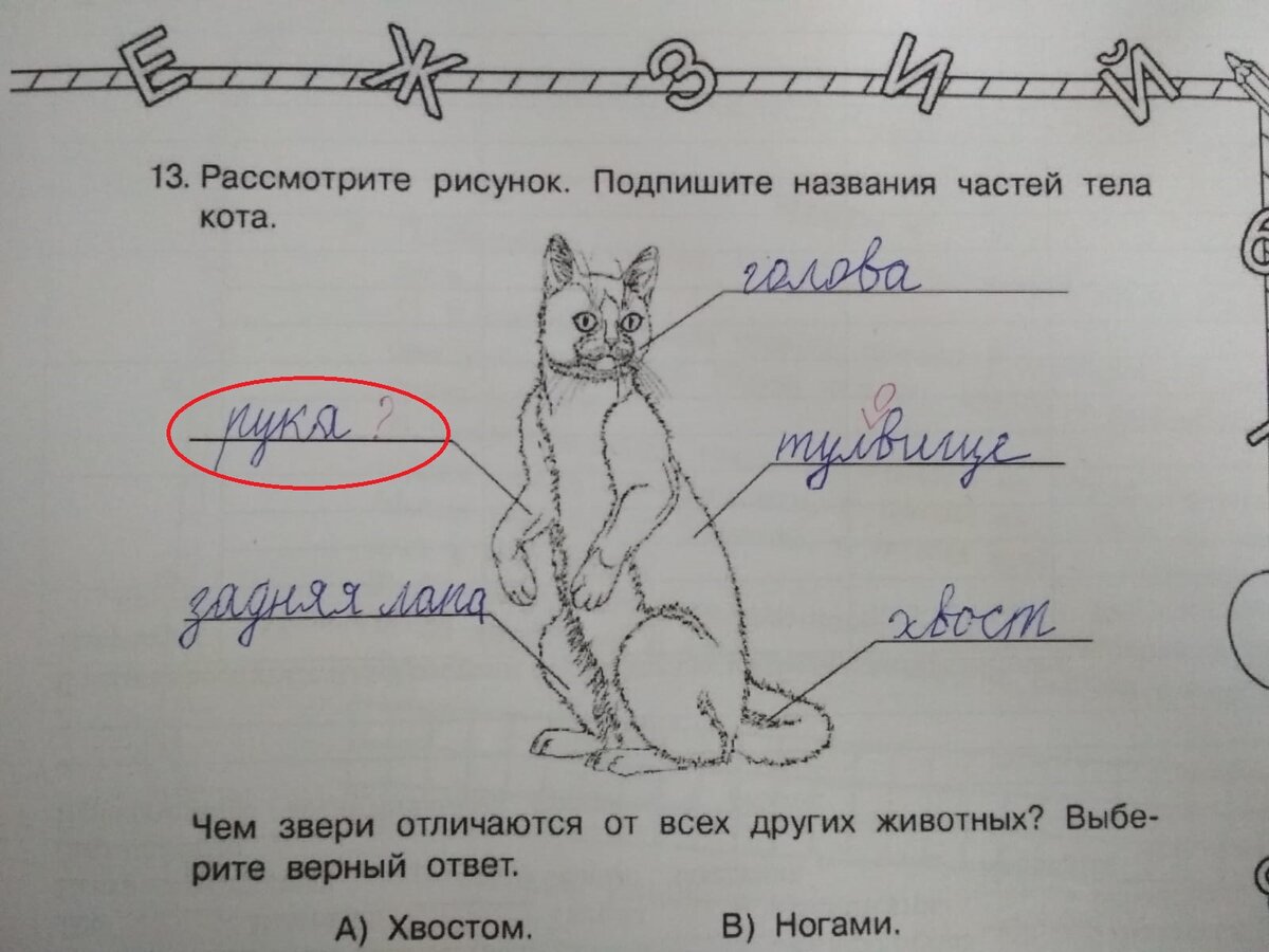 Скажите, любители ли вы посмеяться над учителями? У меня есть для вас печальная новость: они также не против посмеяться над вами. Наверное, почти у каждого учителя найдутся такие работы учеников, которые хочется сохранить, и пересматривать, чтобы поднять себе настроение. Представляю вам подборку десяти ляпов детей в школьных работах. 1) У кошки рука Комплексная работа за 1 класс. Части тела животного. Вполне логично, у кошки есть руки и задние лапы. 2) У мыши 8 см Всё та же комплексная работа, но другого ученика. 3) Шиза, шизик Задание: подобрать несколько слов с буквосочетанием жи-ши. 4) Нежные кексы, а в вазе мыши 5) "Кольянчик" Ну, ребенок услышал это так 6) Герний А эту работу выполнял юный "герний" 7) О школе в двух предложениях Формально ребенок справился с заданием. 8) 3 амечательно! А тут ребенок сам оценил себя. 9) Грюза и красный знак вопроса Что же это за животное такое? Ладно, описАлся, бывает. А что в небе показалось? 10) Назвался Колей… Теперь, Вася, быть тебе Колей до к