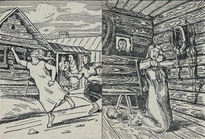 «Крестьянин Никифоров просил крестьян защитить его жену от Игнатьевой, которая будто бы собирается ее испортить, как об этом выкликала больная Екатерина Иванова. Игнатьеву заперли в хате заколотили окна и сожгли. 8-х участников приговорили к церковному покаянию, остальные признаны невиновными. В селении Талуши, Сухумского округа, у одной старой вдовы скоропостижно умер младший сын, а через несколько времени опасно занемог и старший. Больной обратился к ворожее. Ворожея указала на мать как на виновницу его болезни и смерти брата. Соседи развели костер и стали убеждать мать больного или сознаться в грехах, или добровольно отдать себя на сожжение. Потерявшую от страха способность речи старуху привязали к шесту и, как на вертеле, поджаривали, пока она не умерла»[33].