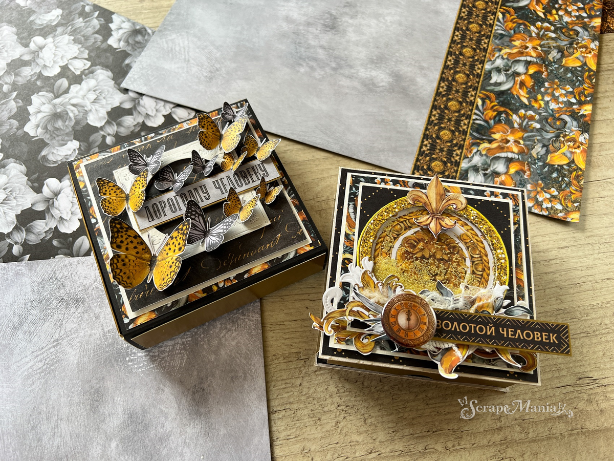 Привет-привет! Сегодня за вдохновение отвечаю я, Оксана Салова и коллекция "Элитный клуб" ! Яркая, торжественная, контрастная, праздничная - эта коллекция просто создана для душевных поздравлений. И я решила не сопротивляться этому настроению, и сделала две подарочные коробочки. Размер каждой коробочки 10х10 см. Внутри можно положить подарочную купюру, несколько памятных фото, карточку с поздравлением, или просто вкусные конфеты. Коллекция выдержана в чёрно-золотых оттенках, но у каждой коробочки получился свой характер. Первая - дамский вариант. Лёгкая, воздушная, как бабочки, которых я использовала для оформления (лист с картинками 10х30 "Элитный клуб. Бабочки"). Главный герой второй коробочки - шикарный Лев. Его изображение я даже поместила в круглую рамочку-шейкер, добавила золотой микробисер, золотую окантовочку и геральдическую лилию. Чтобы подчеркнуть степень шикарности этого персонажа!) И предназначена это коробочка как сюрприз для мужчины. Особенно если он Лев по гороскопу!