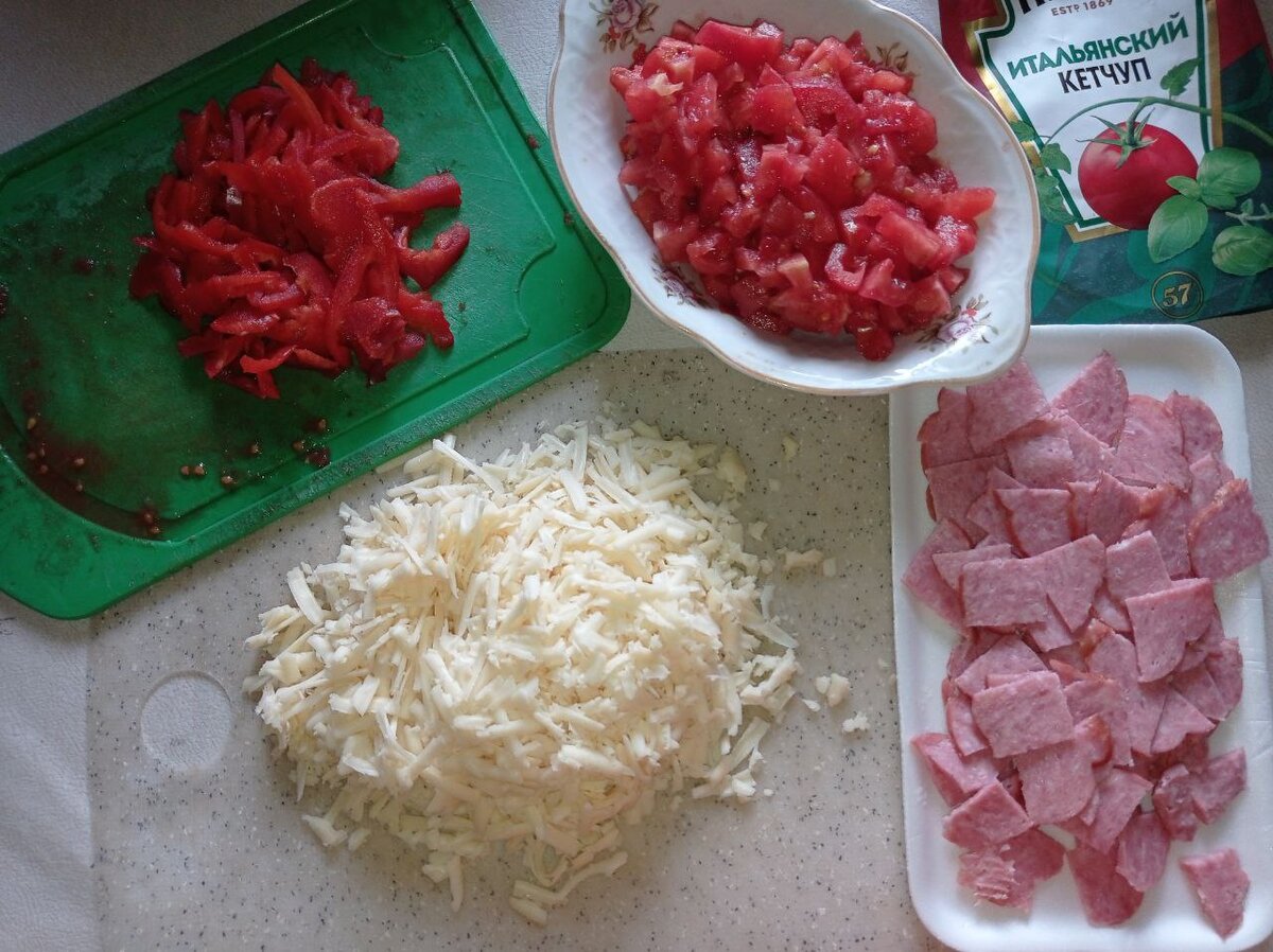 Люблю домашнюю пиццу, особенно, если её готовит мама. Сегодня поделюсь этим рецептом. Начинка будет овощная + колбаса. Ингредиенты: Мука - 400 г. Вода тёплая - 250 мл. Дрожжи пресованные - 15 г. Растительное масло - 4 ст.л. Соль - щепотка Сахар - 1/2 ч.л. Перец - 1 шт. Помидоры средние - 3 шт. Колбаса - 1 упаковка Кетчуп - для основы Сыр - 180-200 г. Огурец малосольный - 1 средний огурец Приготовление: Шаг 1: Начнем делать тесто. Воду смешиваем с дрожжами, солью и сахаром. Перемешиваем до растворения дрожжей. Шаг 2: Добавляем муку и масло. Замешиваем тесто. Оставляем подняться на 1 - 1,5 часа под полотенцем. Шаг 3: Пока поднимается тесто готовим начинку. - Перец порезать соломкой, а соломку поперёк на 3-4 части. - Помидоры залить кипятком на 5 минут. Потом охладить и снять кожицу. Порезать на небольшие кусочки. Не забудьте вырезать серединку! - Колбасу можно нарезать на небольшие кусочки, а можно оставить в первозданном виде. - Сыр натереть на терке, либо купить уже тертый. - Малосол