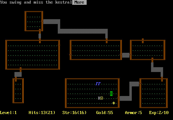 В проектe Пирог – напомню, что это Rogue на Питоне, следовательно Pyrogue – было сделано клиент-серверное взаимодействие. При этом рассматривались различные варианты генерации карты. Всё это можно найти в прошлых выпусках, но предварительная реализация делалась на JavaScript для онлайн-примеров. Пора добавить в сам Пирог хоть какую-то генерацию карты, чтобы можно было идти дальше. Но тут меня посетила ещё одна идея, как это можно сделать, и проиллюстрирую я её конечно опять с помощью JS :) В оригинальном Rogue каждый уровень состоял из 9 комнат, расположенных примерно по сетке 3*3 (некоторые комнаты были вырожденные и становились коридорами). Сама комната всегда прямоугольная. Я решил взять те же 9 комнат, но накидать их без сетки, в полностью случайном порядке. Это привело к тому, что часть комнат, как и раньше, стоит отдельно, а часть наложилась друг на друга. Результатом такого наложения становятся самые разные неровные формы. Между ними достаточно провести коридоры, и уровень готов