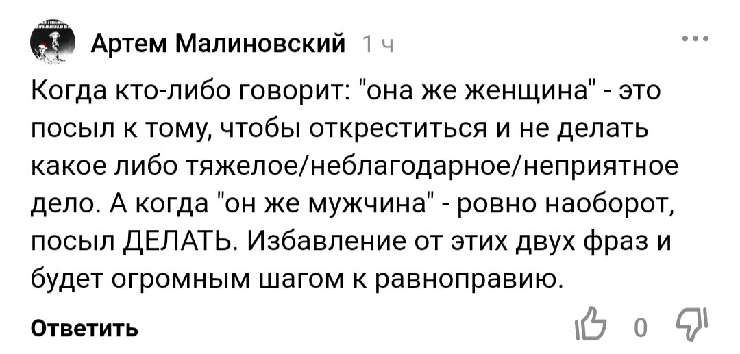 Как иногда интересно читать противоположное мнение. Я сейчас без сарказма, если что. Я вот привыкла к совершению к другому. В моей жизни фразы в стиле "ты ж девочка/ты ж женщина" произносились в большинстве с совершенно другим контекстом. - Начнём с самого начала - детства Все женщины сейчас когда-то были девочками раньше. Конечно, очень сильно зависело от вашего характера, от взглядов на воспитание ваших родителей, от вашей "общей девочковости" - как часто и при каких обстоятельствах вы слышали эту фразу. Понятно, что бунтарка, лазающая по деревьям с вечно разбитыми коленками слышала эти восклицания куда чаще, чем спокойная и любящая куклы. Но эту "тыждевочка" всё равно приплетали. Неидеальный почерк? Ну ты ж девочка, в тетрадях должна быть красота! Не нравится мыть полы? Ну ты ж девочка, должна любить чистоту! Лично я, кстати, так и не научилась держать ручку "как все нормальные люди" и выжимать тряпку "как положено". Потом девочка взрослеет... И складывается ощущение, что всё, чт